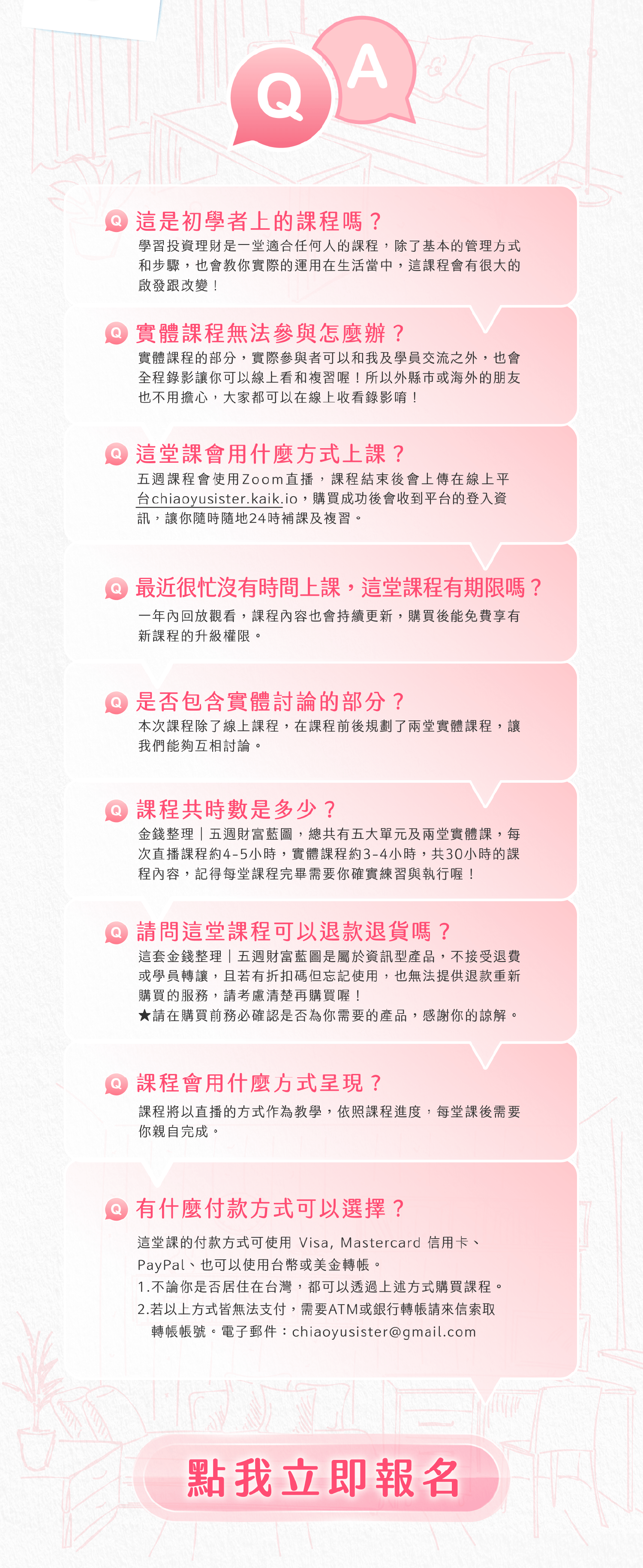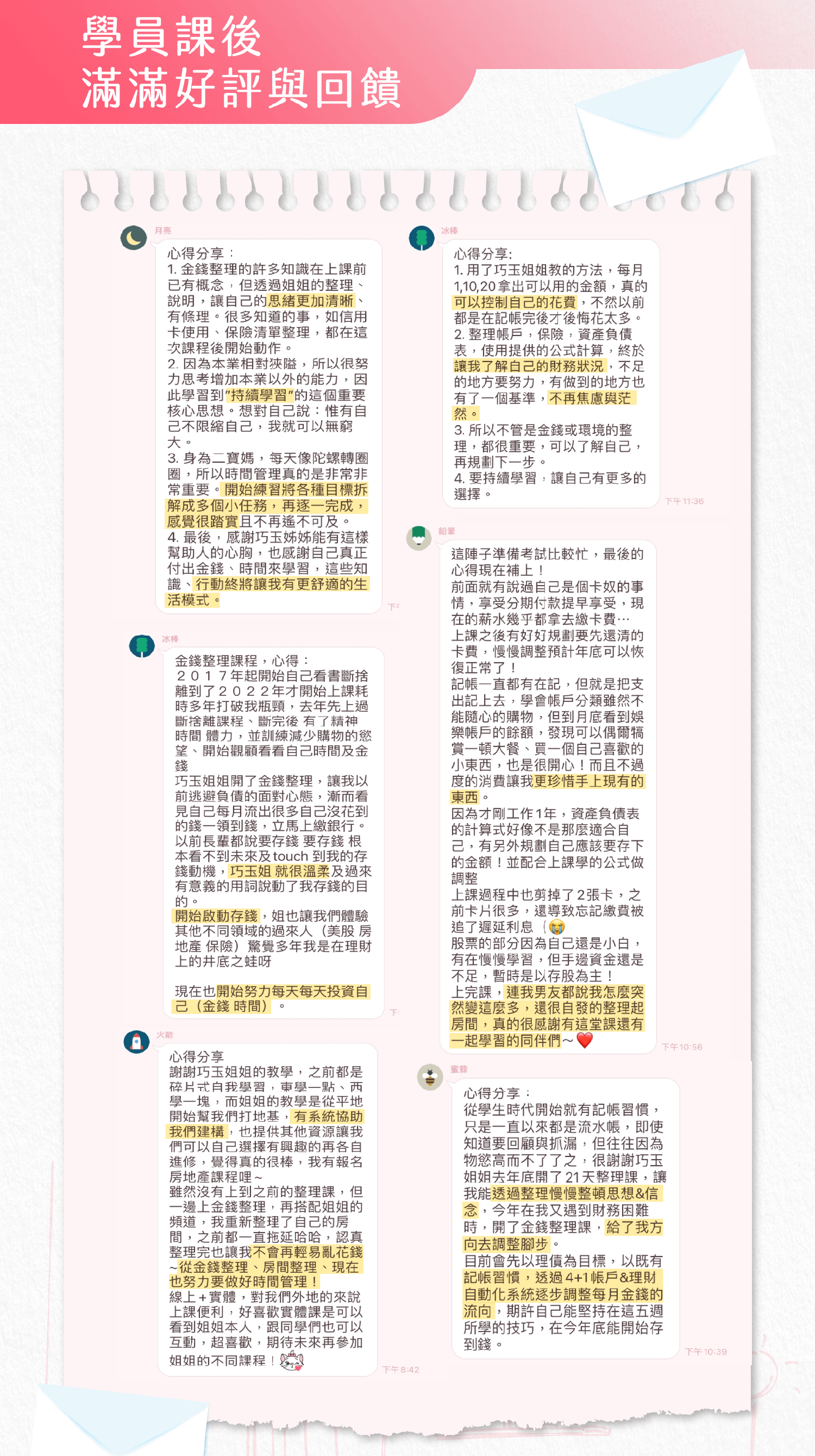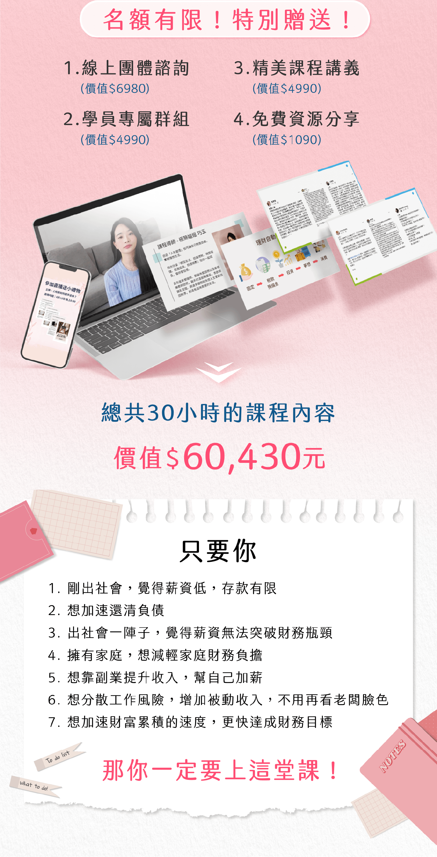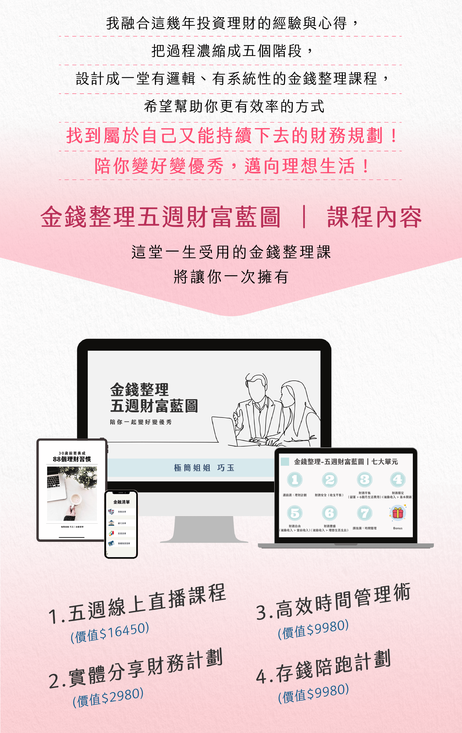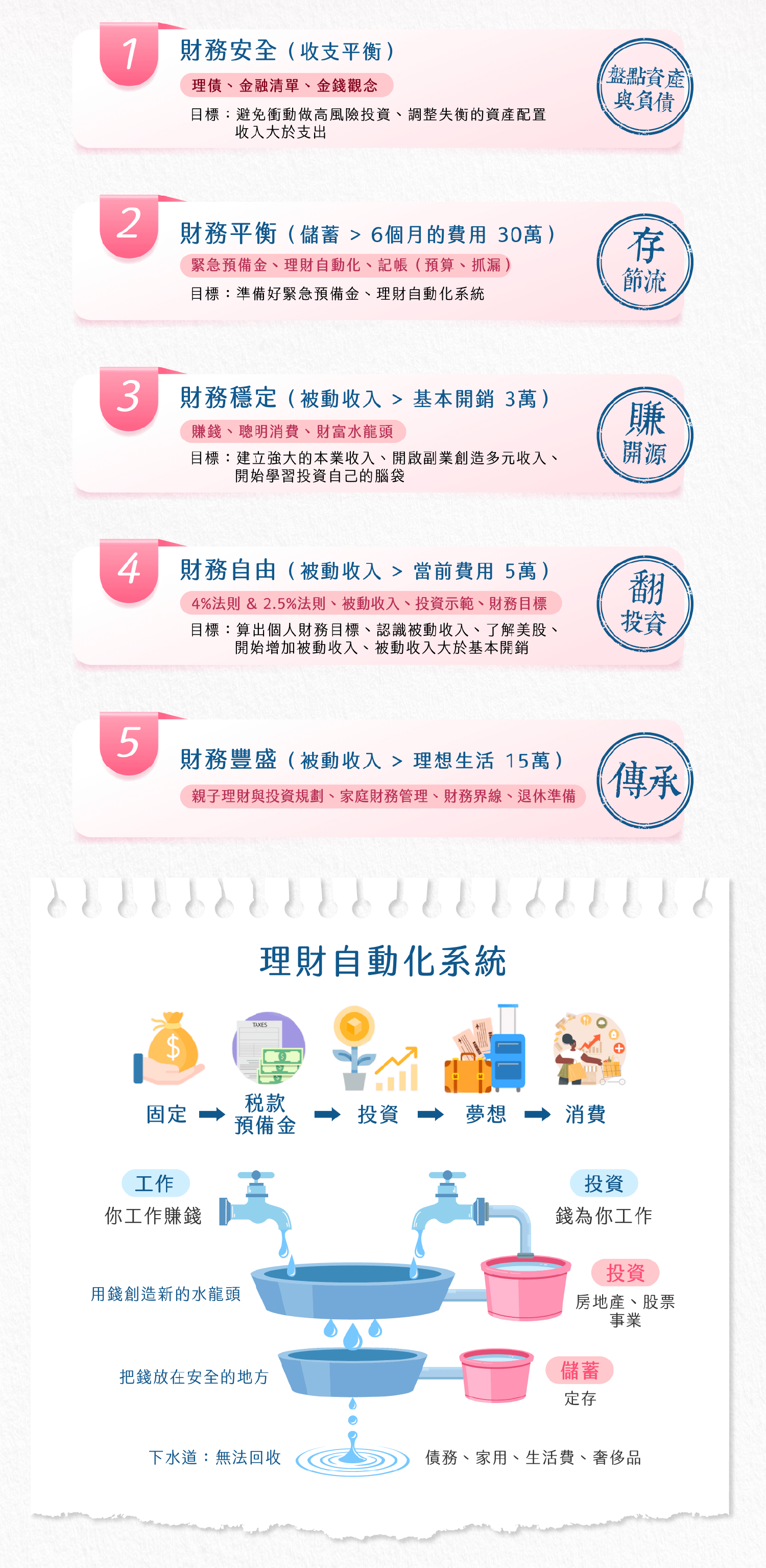 整套課程分成五個階段,分別為財務安全、平衡、穩定、自由以及財務豐盛
