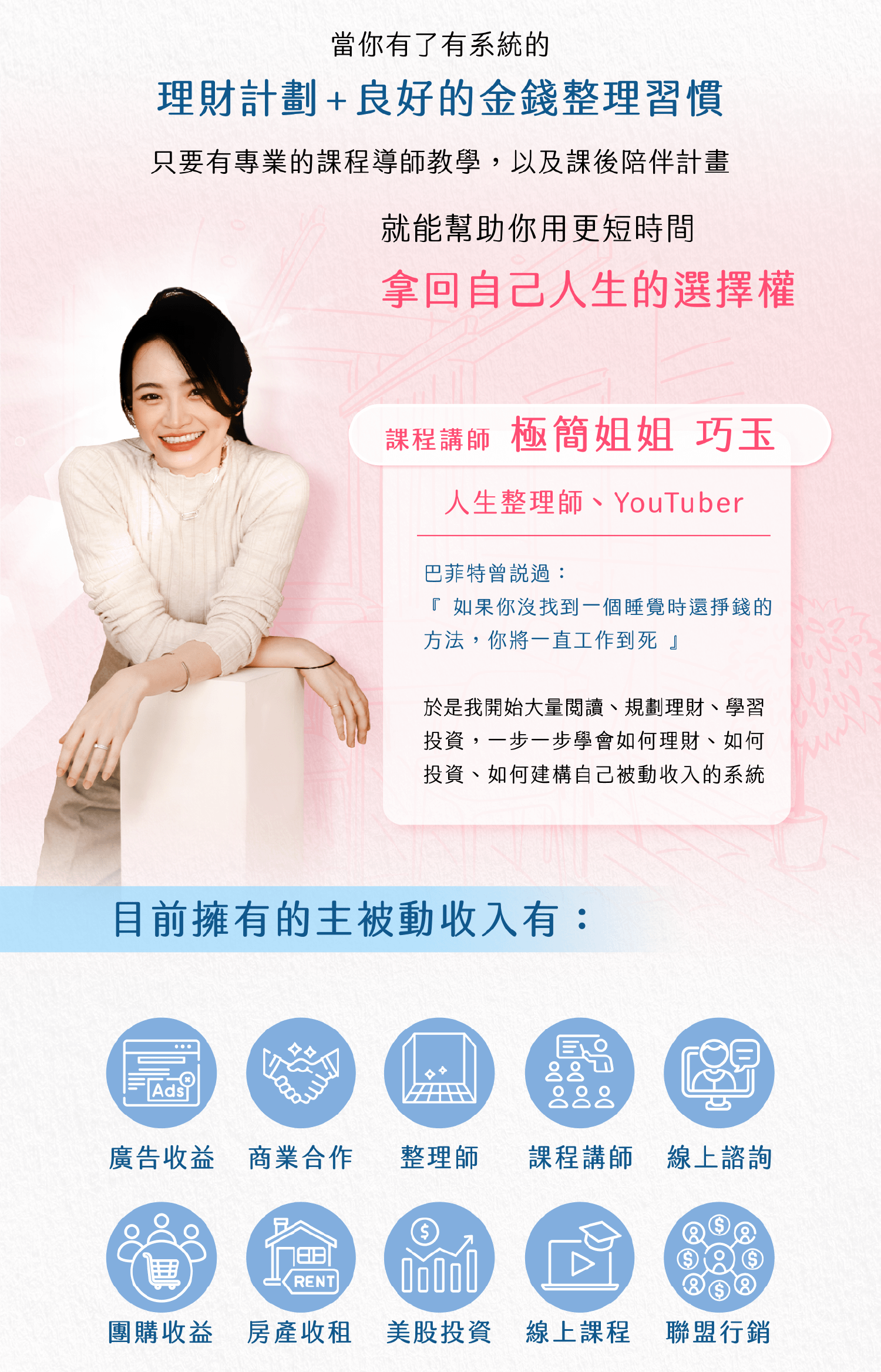 第四階段是「財務自由」,開始打造源源不絕的被動收入,努力讓被動收入大於薪資收入,跟你分享30種被動收入來源,讓你更清楚自己該怎麼做,在這個階段會學習財務自由的公式,自己要準備多少錢能提早退休,除了4%法則、FIRE運動,更推薦的是2.5%法則,它更容易達成,不需要存到幾千萬也能安心生活,又能降低投資風險,增加財務安全感,另外我會示範平時是如何投資美國股票,從尋找標的、評估公司體質,算出進場價格,實際下單操作給你看完整的流程。